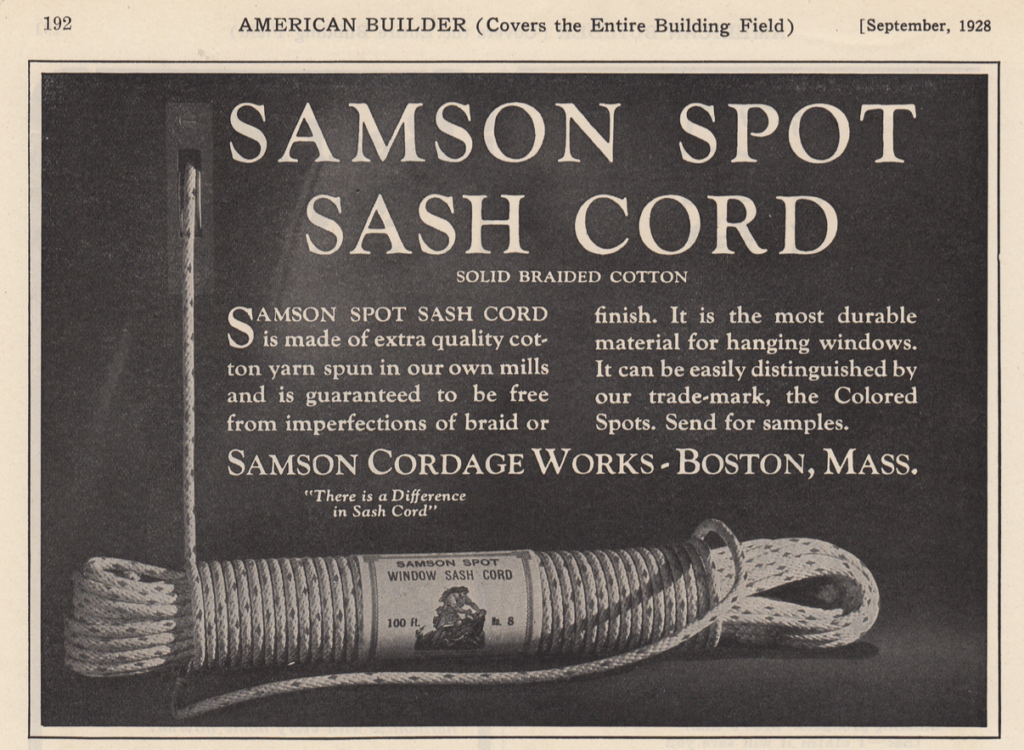 Incredibly, Samson Spot Sash Cord is still being made. Red diamonds woven into the cotton for an extra signature. The only difference now is the hidden nylon core, which takes a lot of brunt off of the organic fibers. Occasionally, one may find clippings of old spot-cordage at the bottom of a panel-pocket. 1/4″ is the standard for main-level double-hung, and 3/16″ is appropriate for basement & attic use.